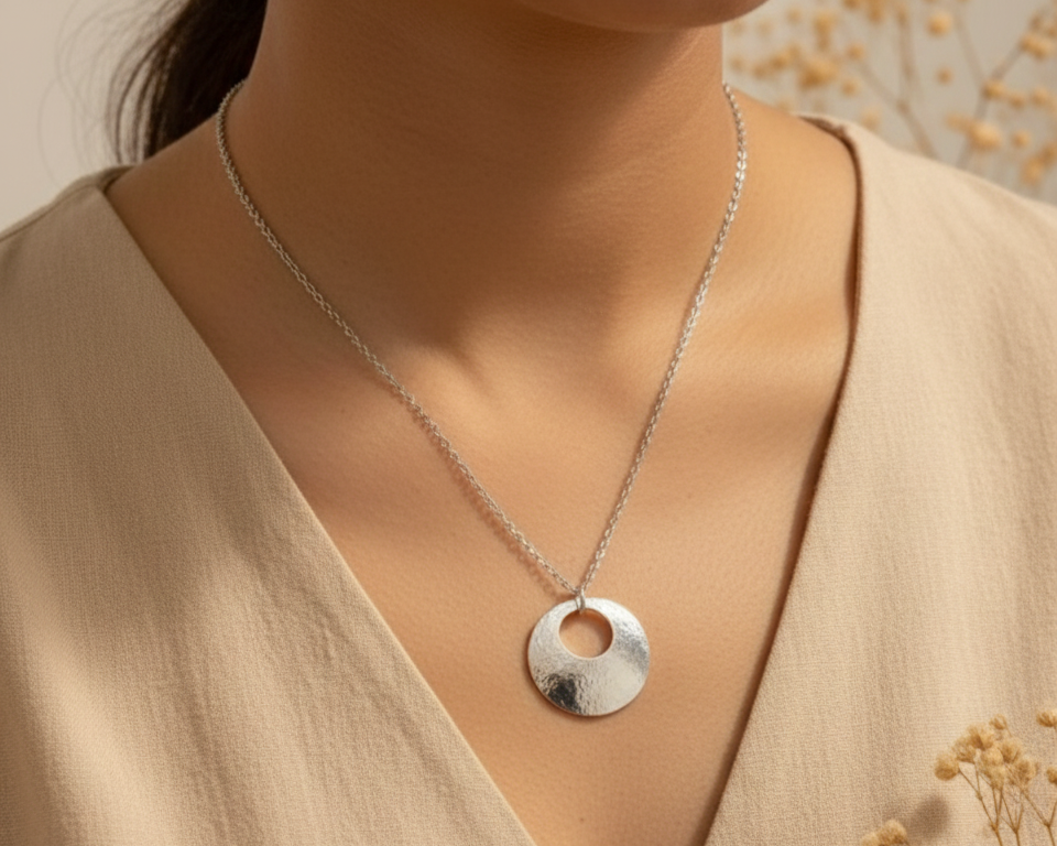 Not everyone wants sparkle. Some people just want a beautiful shape. The Hammered Domed Disc Pendant is one of those pieces you can throw on with anything. The hammered finish gives it a soft sheen and the domed shape makes it feel sculptural and tactile.